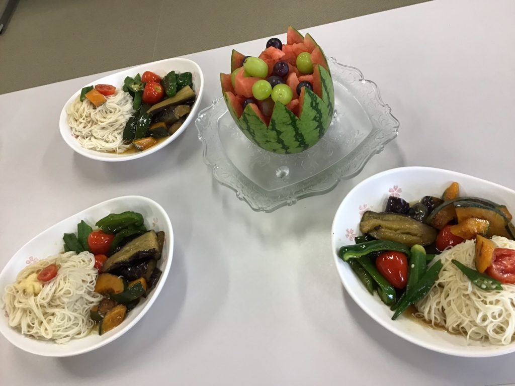 夏野菜の焼き浸しとスイカのフルーツポンチを作りました。野菜の焼き浸しは、そうめんと、とても合って美味しくいただきました。次回はちょうど彼岸の頃に当たるので、おはぎと実だくさんの澄まし汁を作る予定です。