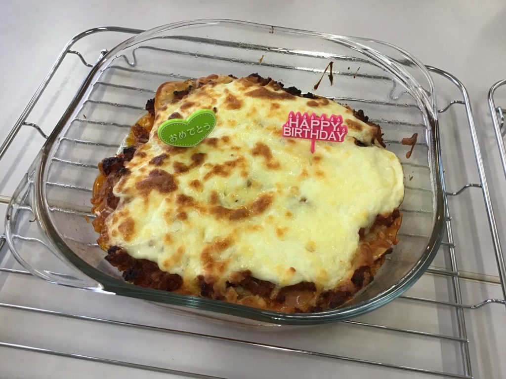今月はサラダ、ラザニアとヨーグルトスィーツ。ラザニアは餃子の皮を重ねてつくりました。ミートソースとホワイトソースがマッチしてとても美味しいでした。ヨーグルトには、甑島産夏みかんのマーマレードとイチゴのジャム添え、どちらも手作り。次回は、ちらし寿司と関東風桜餅を作ります。